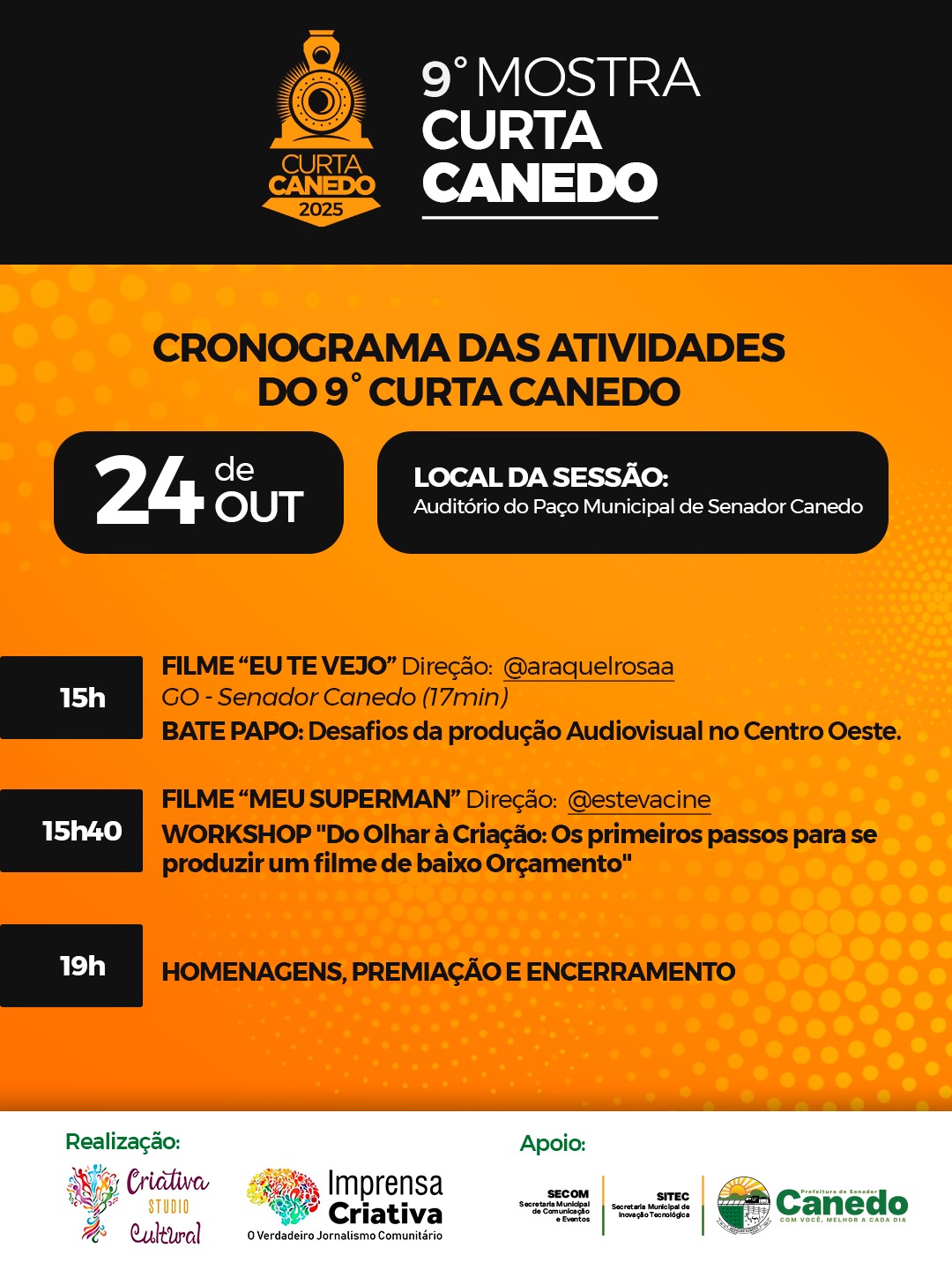A Prefeitura de Senador Canedo, por meio da Secretaria Municipal de Inovação Tecnológica (SITEC) e da Secretaria de Comunicação e Eventos (SECOM), convida o público e a imprensa local para prestigiar o encerramento do 9º Festival Curta Canedo, que acontece nesta quinta-feira, 24 de outubro, no Auditório do Paço Municipal.