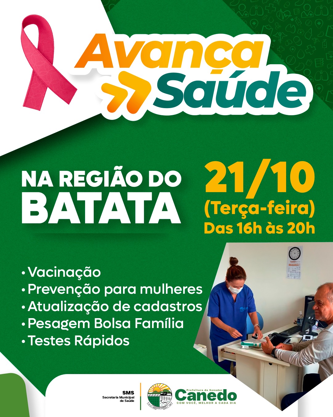 A Prefeitura de Senador Canedo, por meio da Secretaria Municipal de Saúde, promove nesta terça-feira, 21, mais uma edição do Avança Saúde, desta vez na região do Batata. A ação tem como objetivo levar serviços de saúde e assistência social mais perto da população, garantindo cuidado, prevenção e cidadania.