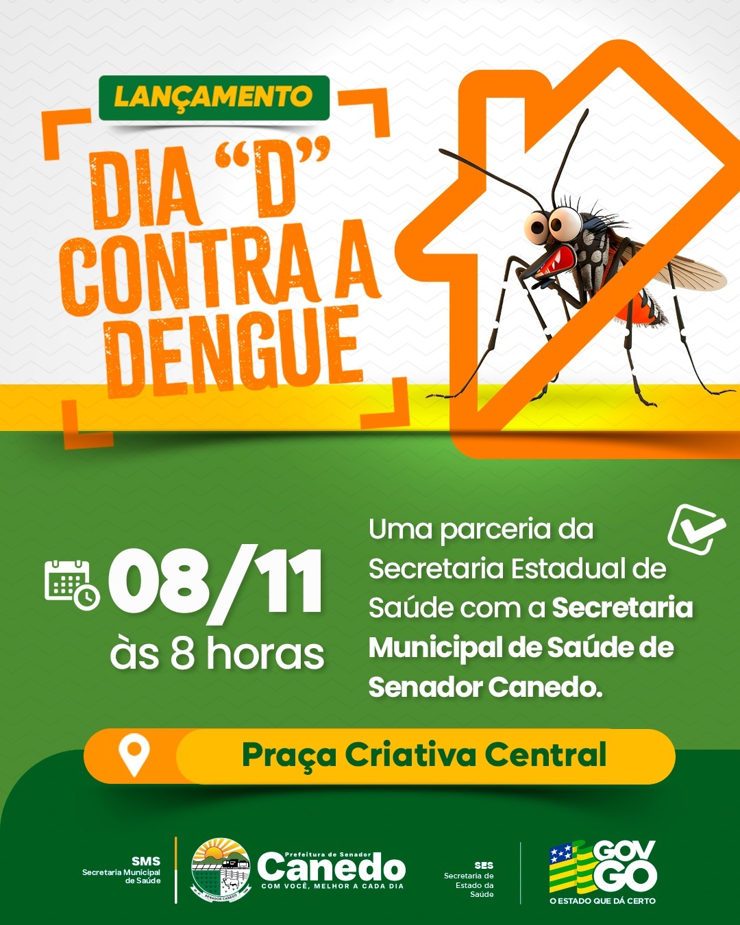 A Prefeitura de Senador Canedo, por meio da Secretaria Municipal de Saúde, realiza neste sábado, 8, o lançamento oficial do Dia D de Combate à Dengue. A ação, em parceria com a Secretaria de Estado da Saúde de Goiás (SES-GO), será realizada a partir das 8 horas, na Praça Criativa Central.